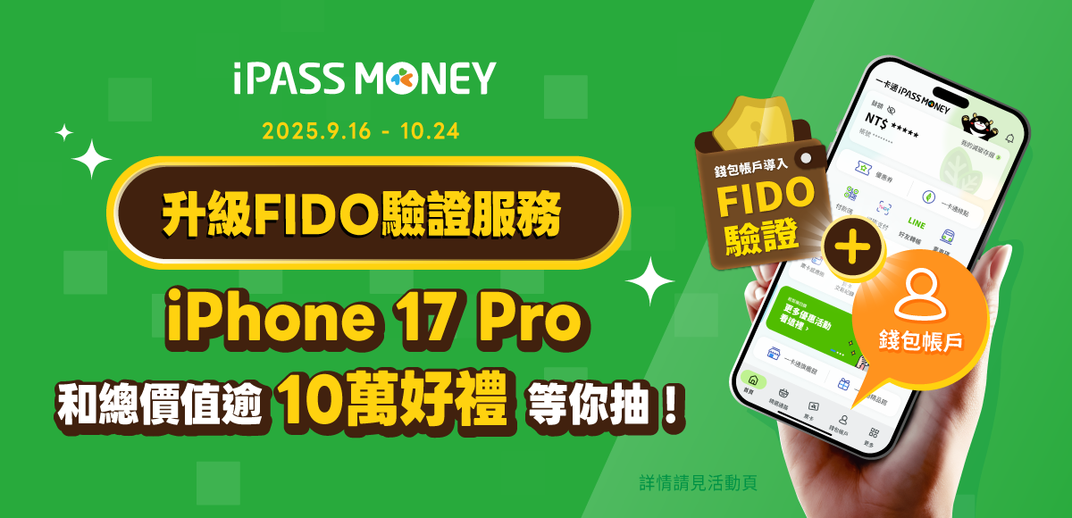 - 部分手機型號或作業系統欲完成FIDO驗證需建立金鑰,須同意建立方可順利啟用FIDO驗證功能。如因手機型號或手機系統等相關軟體或韌體因素導致無法啟用FIDO服務或透過FIDO驗證登入錢包帳戶,恕無法參加活動,亦不得要求賠償。欲參與本活動者,須先於一卡通 iPASS MONEY APP 首頁點選「錢包帳戶」>個人設定中選擇「登入錢包帳戶 FIDO 驗證服務」,啟用 FIDO 驗證服務,並限以本人資料完成驗證。