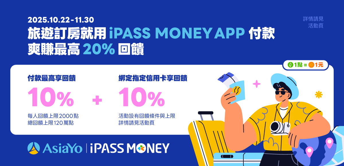 【AsiaYo】旅遊訂房就用 iPASS MONEY APP 付款最高享 20% 回饋!