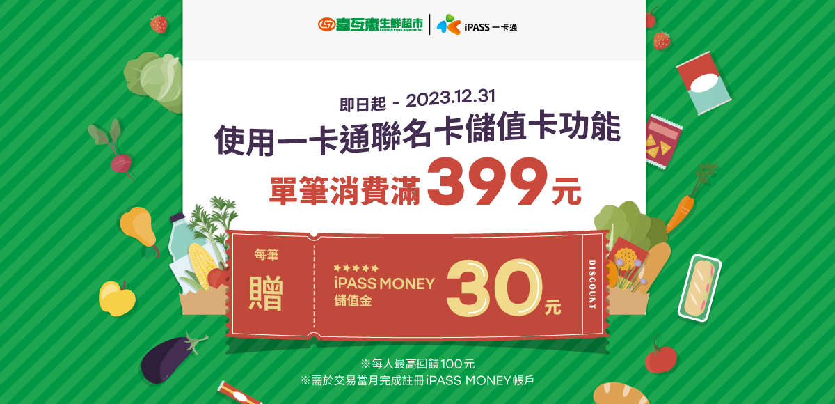 於喜互惠使用一卡通聯名卡儲值卡功能單筆消費滿 399 元,每筆贈 30 元 iPASS MONEY 儲值金,每人最高回饋 100 元。