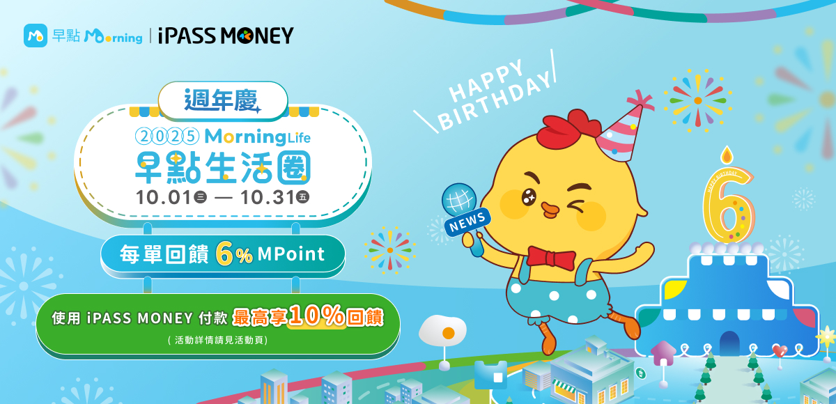 - 請註冊/登入早點 Morning 會員並於活動期間於早點 Morning 指定通路,每筆訂單使用線上支付,享 6% 點數回饋(四捨五入至整數),不限下單次數,計算方式以訂單實際支付金額為主。
