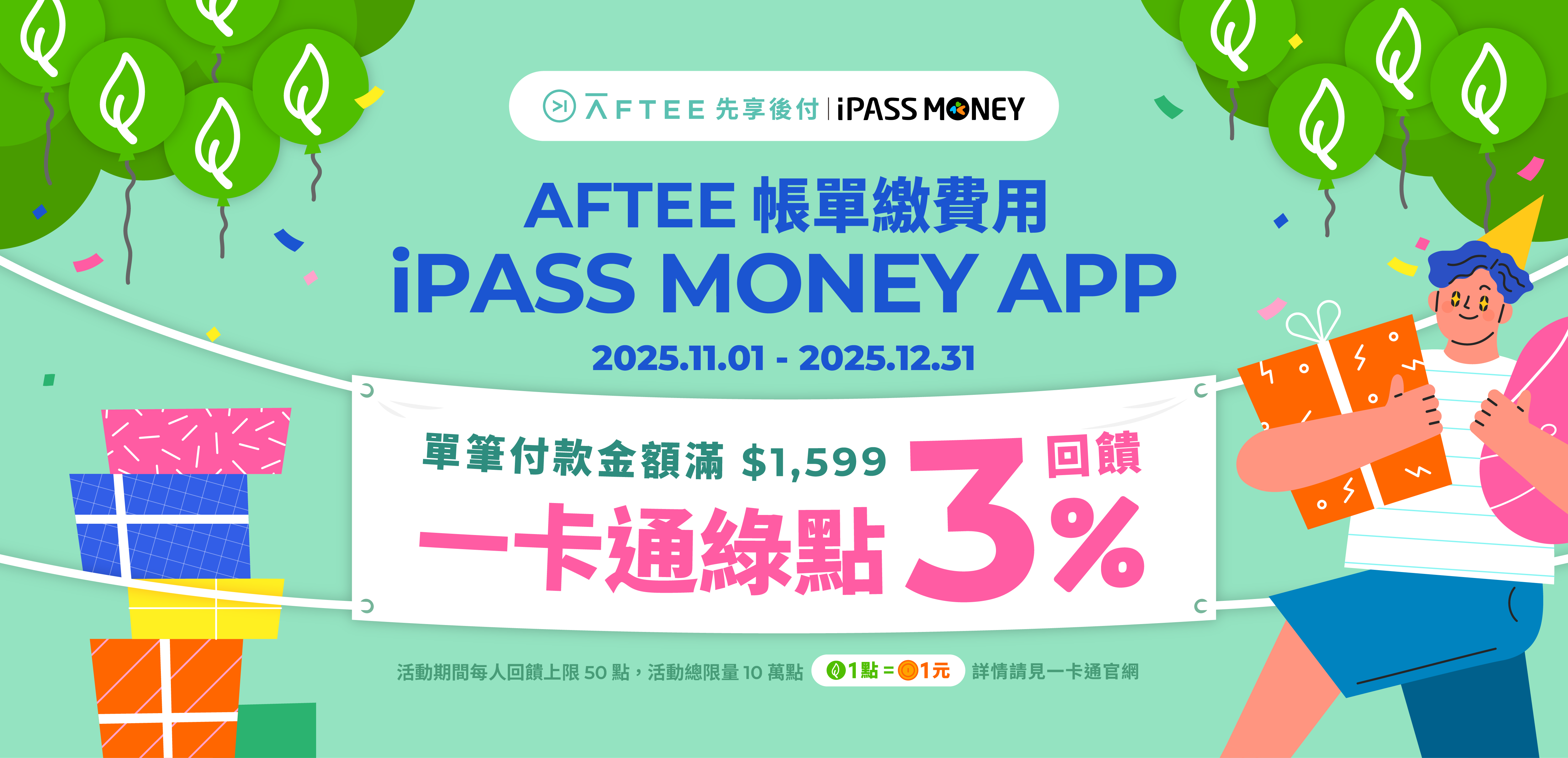 活動內容:活動期間內於 AFTEE APP 繳納 AFTEE 先享後付帳單時選用「iPASS MONEY 帳戶」付款,單筆付款金額滿 1599 元享一卡通綠點 3% 回饋。