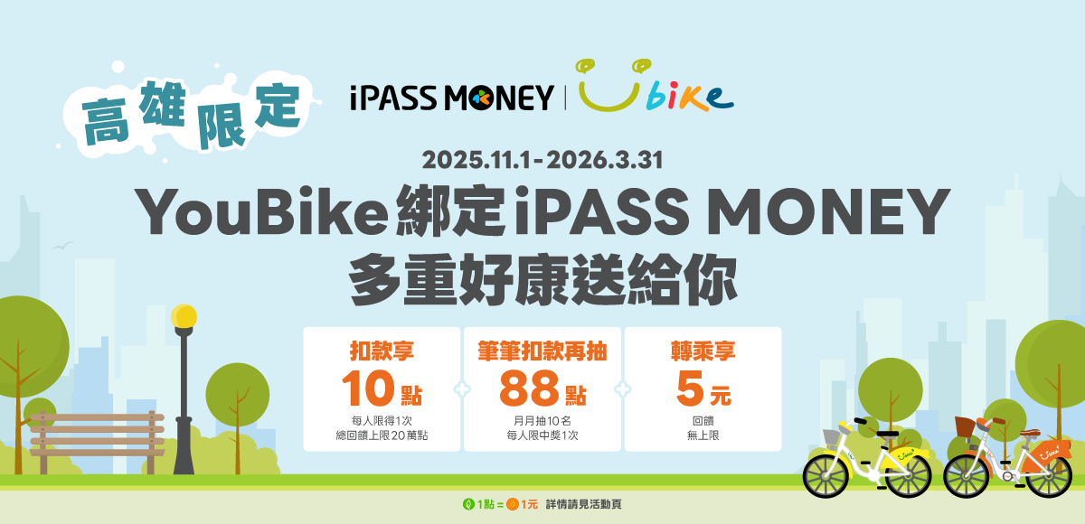 - 租用 YouBike 2.0 / 2.0E 且實際扣款前後一小時內,透過 iPASS MONEY「乘車碼」功能搭乘高雄市指定交通運輸工具,每次轉乘享 iPASS MONEY 帳戶儲值金 5 元回饋,回饋無上限。【此活動為高雄市政府補貼之優惠,補助截止日期依高雄市政府公告】