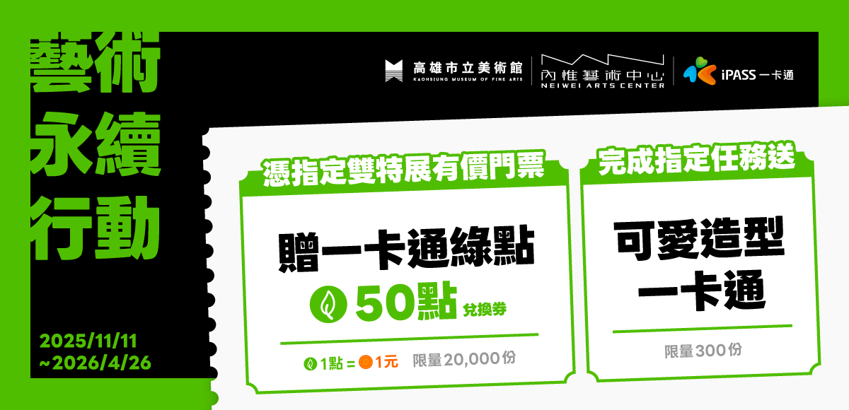 ★一卡通綠點 1 點價值等於 1 元,可折抵一卡通記名卡及 iPASS MONEY 乘車碼交通搭乘金,歡迎多多搭乘大眾運輸前往觀展,支持藝術低碳永續行動。一卡通綠點介紹