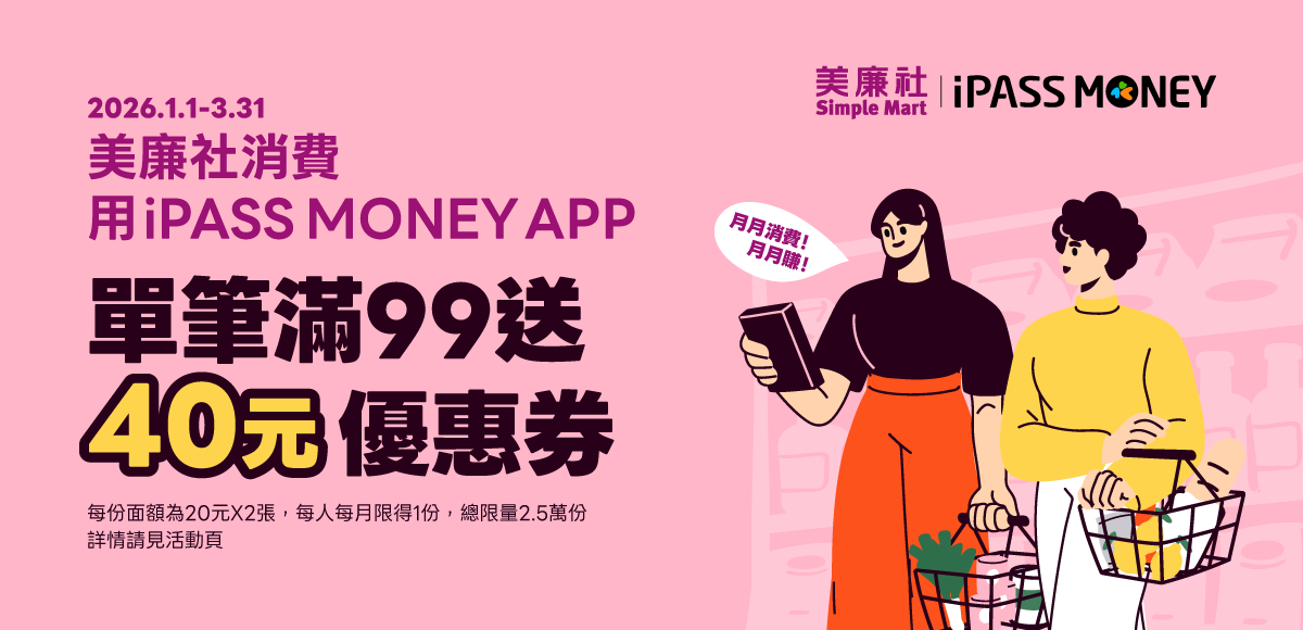 優惠一:活動期間於美廉社實體門市現場消費,結帳時使用 iPASS MONEY APP 開啟「付款碼」付款,單月單筆消費滿 99 元,即贈送 iPASS MONEY 優惠券 20 元 2 張。