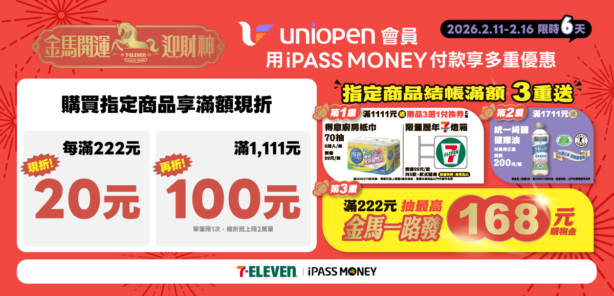 - 此回饋僅適用於 uniopen 會員於 7-ELEVEN 便利商店實體門市現場購買指定商品,並使用 iPASS MONEY APP 完成付款,付款滿額且後續未退款,其他支付方式無配合此活動。