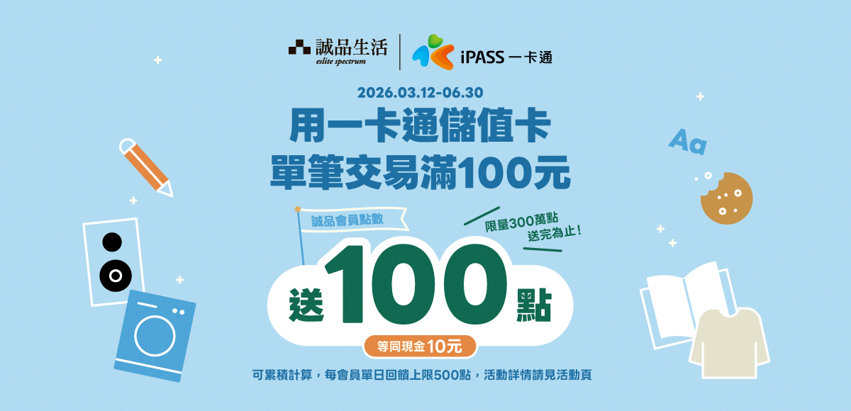 - 參加本活動即代表已詳細閱讀、了解並同意遵守服務條款、所有活動內容及注意事項,不得以任何理由要求補發活動回饋;此外,一旦發現有用戶以任何方式違反服務條款或活動公平原則的行為,誠品生活與一卡通公司有權取消該用戶活動資格並回收已發放的回饋點數。