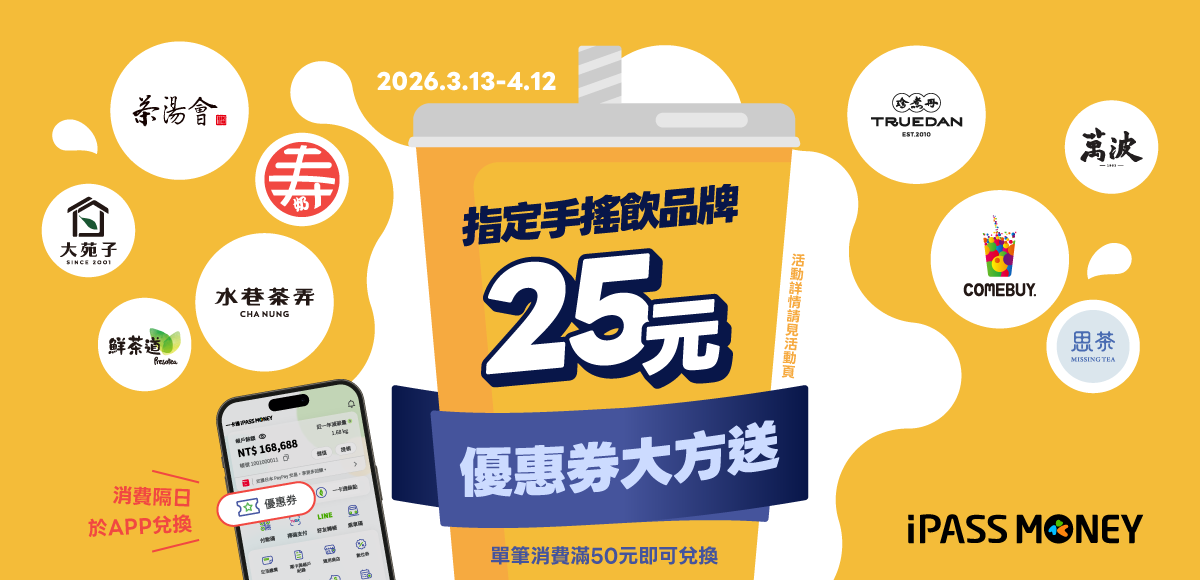 活動期間於 iPASS MONEY APP 輸入指定優惠券代碼,即可領取手搖飲優惠券 25 元,於合作手搖飲品牌之指定店家,結帳時使用 iPASS MONEY APP 開啟「付款碼」單筆付款滿 50 元,即可於隔日使用優惠券兌換儲值金。