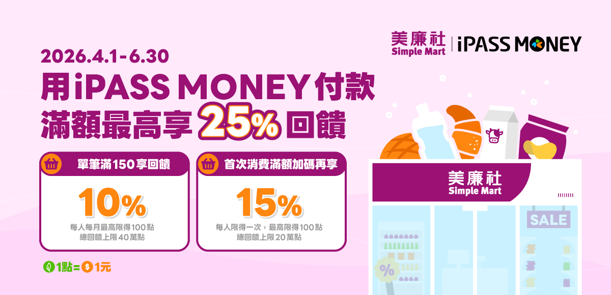 - 限於 2026/4/1 00:00 前從未使用過 「iPASS MONEY APP」消費之用戶,即符合本活動「首次使用 iPASS MONEY APP 消費」資格。(如過去曾透過 LINE Pay 使用 iPASS MONEY 消費,但未曾透過「iPASS MONEY APP」消費,即符合首次使用 APP 消費資格)