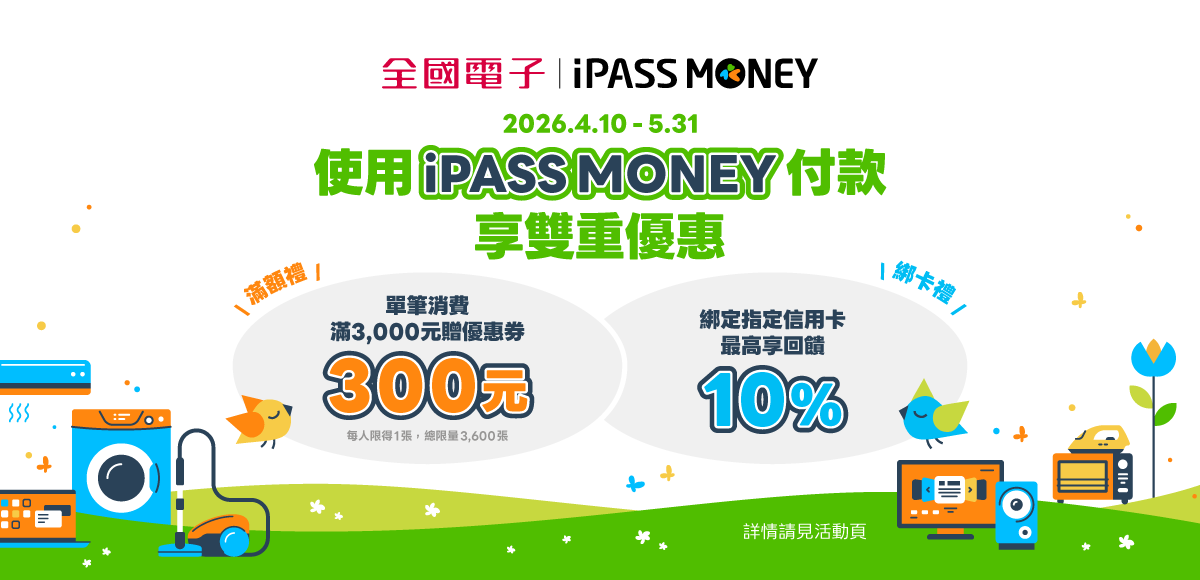活動期間於全國電子實體門市消費,結帳時使用 iPASS MONEY APP 開啟「付款碼」付款,單筆消費滿 3,000 元,贈送 iPASS MONEY 300 元優惠券。