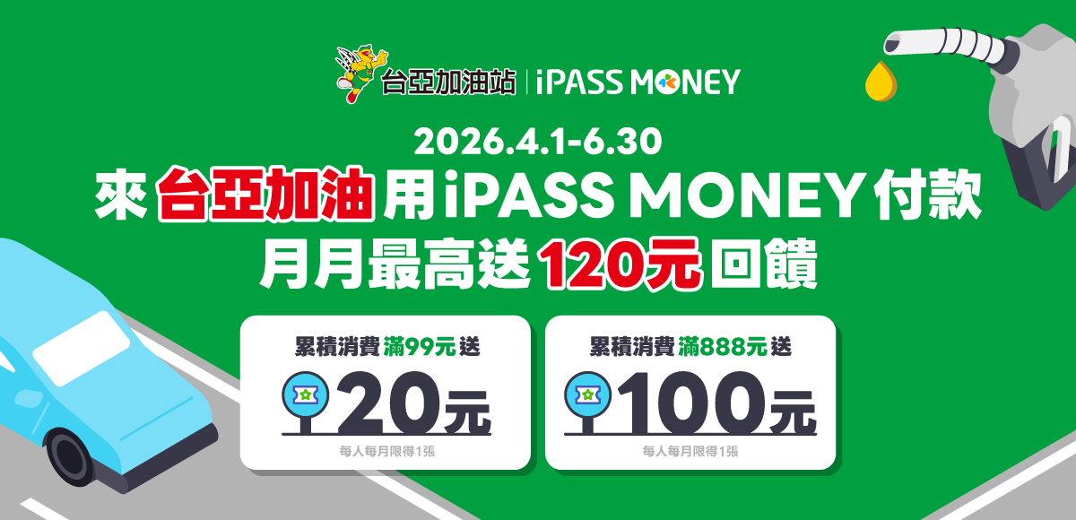 【台亞加油站】加油就用 iPASS MONEY,月月最高送 120 元!綁卡消費再享最高 10% 回饋!