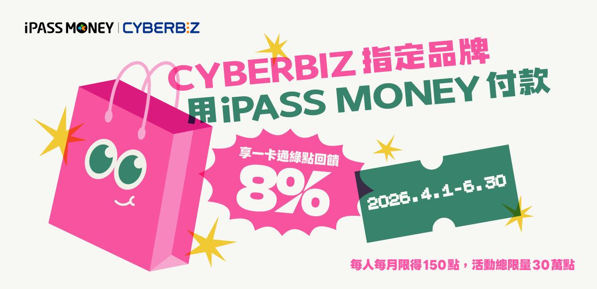 - 於本活動期間內於指定品牌使用 iPASS MONEY成功付款任一筆,即符合活動回饋資格。回饋之一卡通綠點以「當月於 CYBERBIZ 指定品牌累積消費金額 x8%」計算,小數點後四捨五入。如用戶於 2026/4/5 使用 iPASS MONEY 於指定品牌成功付款 700 元,於 4/12 又在指定品牌成功付款 800 元,則當月回饋點數以 1,500 元 X 8% 計算,小數點後四捨五入,1 月共可獲得一卡通綠點 120 點,所獲得之點數將於 5 月底前回饋至 iPASS MONEY 帳戶中(用戶須於 4 月底前同意加入一卡通綠點回饋)。