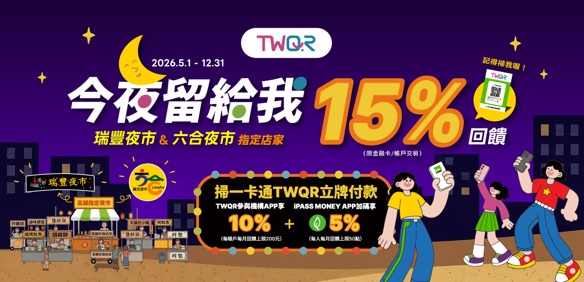 活動期間於高雄六合夜市與瑞豐夜市指定 TWQR 店家消費,使用支援 TWQR 交易之金融機構支付工具,包含「台灣Pay」(行動銀行/台灣行動支付 APP ) (限金融卡/帳戶)、電子支付機構 APP (下稱指定電支機構 APP )掃描「一卡通 TWQR 立牌」付款,消費金額享 10% 現金回饋。