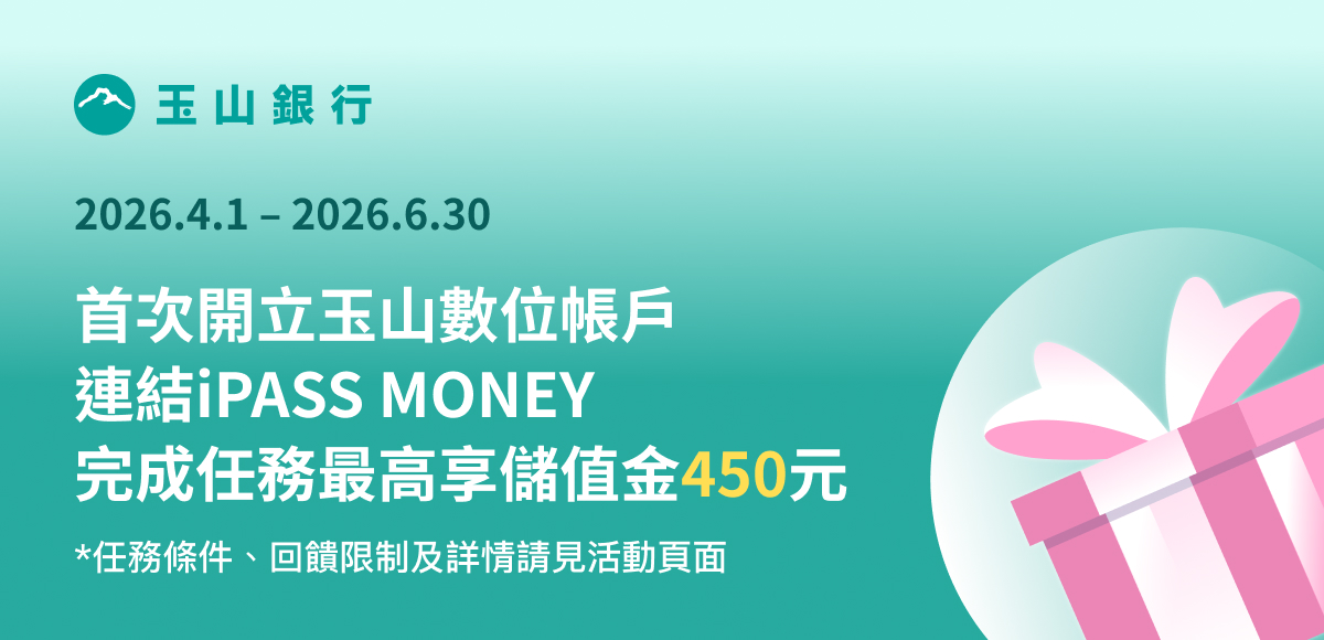 ►【活動1】玉山全新存戶於2026/4/1 - 2026/6/30(含)首次且同時開立玉山臺幣及外幣數位存款帳戶,且於 2026/6/30 (含)前成功通過帳戶審核者(以申請後收到玉山銀行通知帳戶開立成功為憑)。並於開戶後至 2026/6/30 前,以首次開立之臺幣數位帳戶連結 iPASS MONEY 並使用 iPASS MONEY APP 完成單筆滿 100 元之消費或繳費交易,且後續未取消交易,方符合活動資格。