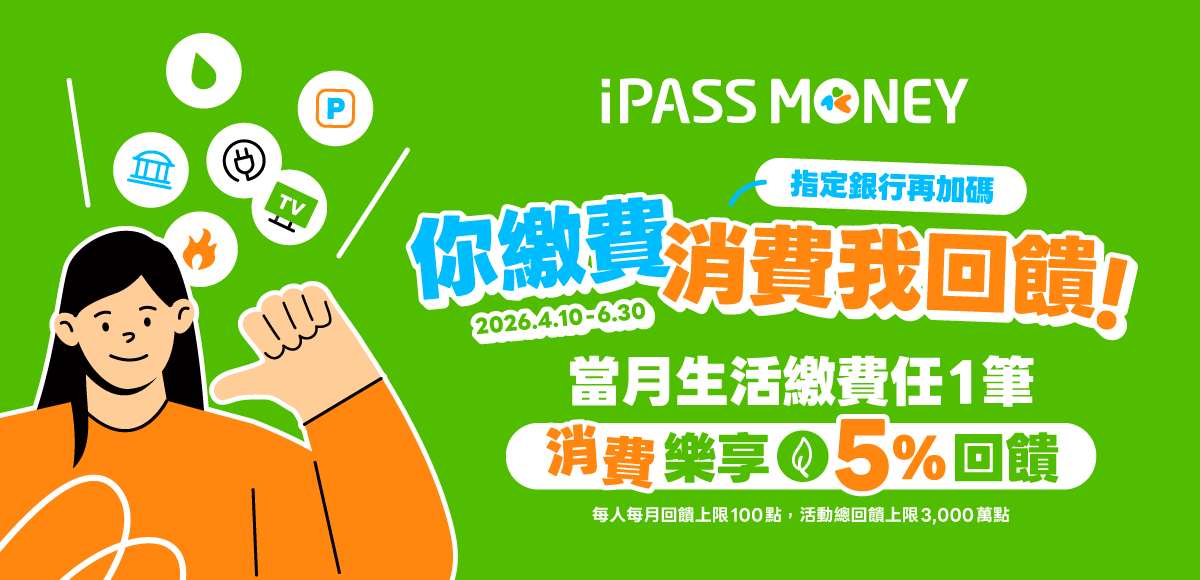 活動期間內,當月使用 iPASS MONEY APP 成功繳納本活動指定生活繳費項目費用任 1 筆,同月使用 iPASS MONEY 消費總額樂享一卡通綠點 5% 回饋。每人每月回饋上限 100 點,活動總回饋上限 3,000 萬點(一卡通綠點 1 點價值新台幣 1 元,可於事後全額折抵繳費金額獲得儲值金回饋)