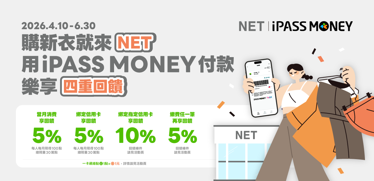 活動內容:活動期間於 NET 獨立實體門市消費,結帳時使用 iPASS MONEY APP 付款,可享以下優惠: