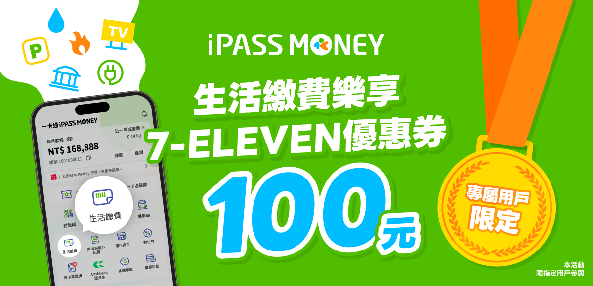 2026/6/30 前,首次使用 iPASS MONEY APP 成功繳納活動指定生活繳費項目費用,當月繳費總額樂享一卡通綠點 5% 回饋。每人限得 1 次,回饋上限 150 點,活動總回饋上限 3,000 萬點(一卡通綠點 1 點價值新台幣 1 元,可於事後全額折抵繳費金額獲得儲值金回饋),本優惠為原【 iPASS MONEY 生活繳費】活動,活動辦法與回饋條件詳請見 活動網頁。