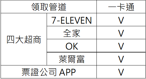 (二)領取方式:可持票卡至四大超商櫃台由店員協助或至指定公共運輸場站加值機台等管道靠卡領取。